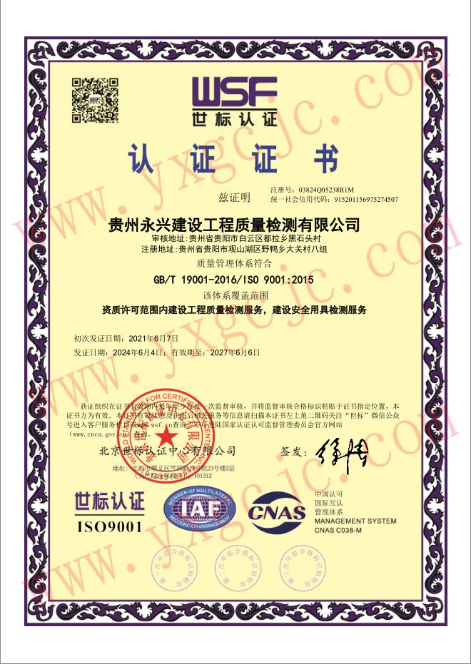 貴州永興建設(shè)工程質(zhì)量檢測有限公司成立于2009年12月21日,主要承接房建、市政、鐵路、公路工程質(zhì)量檢測業(yè)務(wù),并開展新技術(shù)、新材料、新工藝的研究開發(fā)與推廣應(yīng)用。公司取得的資質(zhì)有:建設(shè)工程質(zhì)量檢測(見證取樣、地基基礎(chǔ)、主體結(jié)構(gòu)、鋼結(jié)構(gòu)、門窗幕墻、室內(nèi)環(huán)境)、公路工程試驗(yàn)檢測、工程勘察、雷電防護(hù)裝置檢測。公司通過檢驗(yàn)檢測機(jī)構(gòu)資質(zhì)認(rèn)定批準(zhǔn)檢測項(xiàng)目156項(xiàng)、檢測參數(shù)1422個(gè),公司還通過了質(zhì)量管理、環(huán)境管理、職業(yè)健康安全管理體系認(rèn)證。 ...